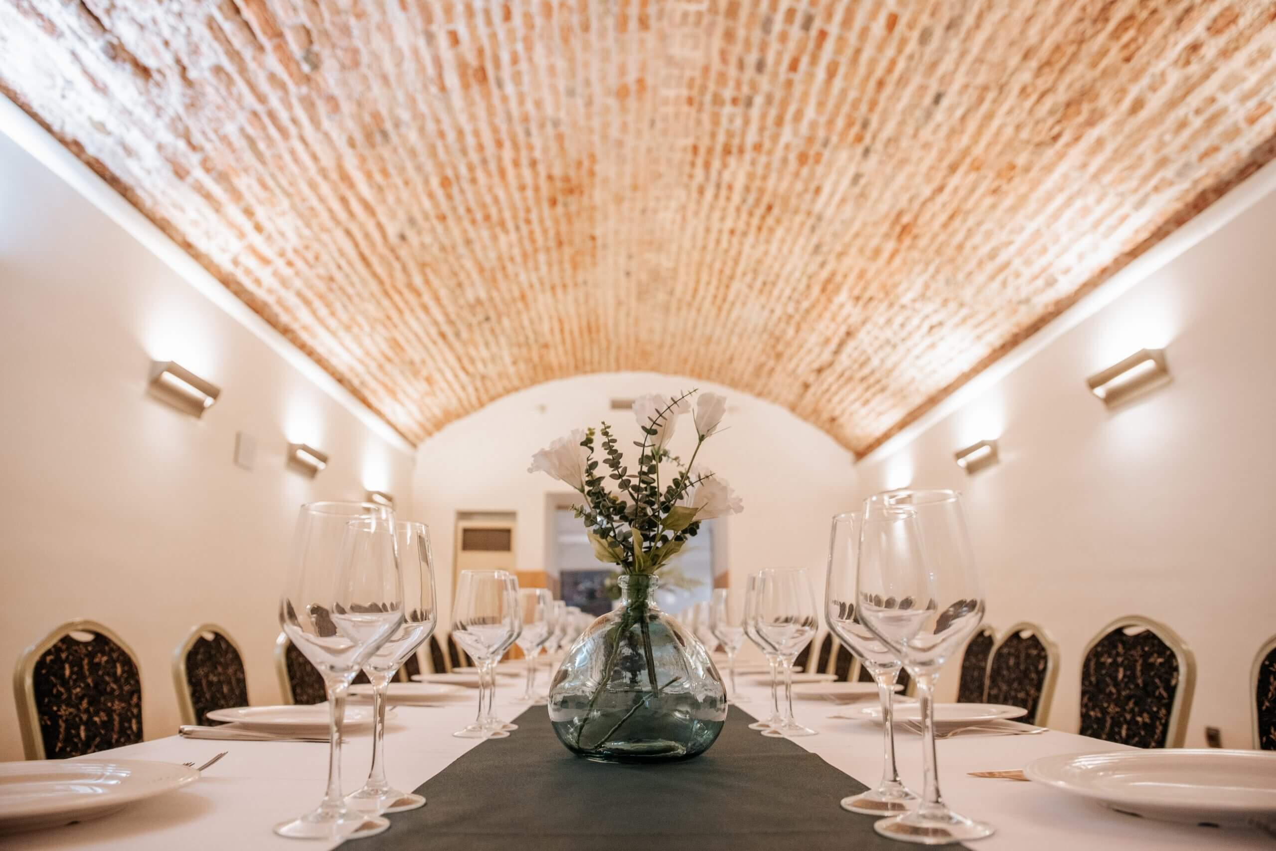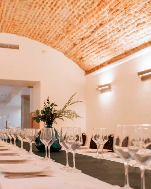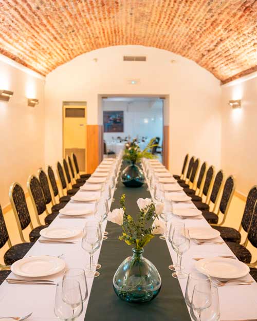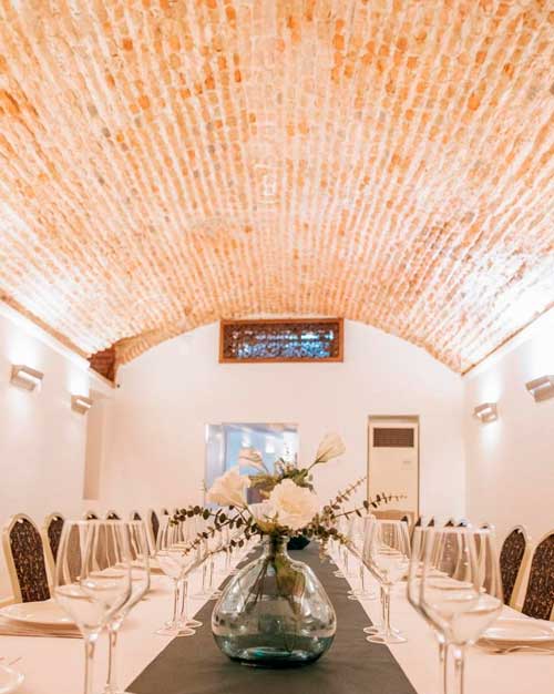 This hall stands out for its impressive vaulted ceiling of exposed brick, which adds character and warmth. Its elongated, symmetrical layout, combined with carefully designed lighting, creates an intimate and welcoming atmosphere—perfect for private celebrations in a truly distinctive setting.